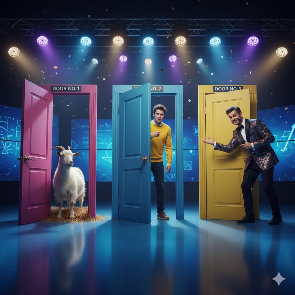 All right, let’s play a game. You’re on a cheesy ‘7s game show, standing under hot studio lights while wearing a suit. The host, Monty Hall, greets you with a big smile and points to three doors. Behind one door, a brand new car. Behind the other two, goats. You pick a door, let’s say door number 1. Monty, who knows what’s behind all of them, opens another door, say door number 3, and reveals a goat. Then he looks at you with his big game show grin and says, “Do you want to stick with your door or switch to the other one?” Now, here’s where the paradox kicks in.